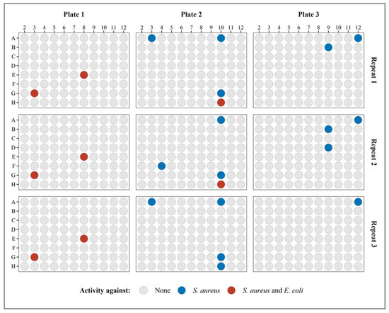 To test and validate the performance of the BLSA assay, it was used to discover bacterial soil isolates with antimicrobial activity. A total of 264 isolates spanning over the wells of three plates were tested in triplicate using the BLSA assay in the agar-broth format. Figure 9 displays all the plate results during the validation test runs, with highlighted wells containing the putative antimicrobial-producing isolates or bacterial hits. In total, ten bacterial hits were identified of which seven were active against only S. aureus. The assay was generally repeatable with five bacterial hits displaying activity in all repeats, three in two out of three repeats, and two only in one repeat. Three of these isolates showed activity toward E. coli. There was a slightly bigger discrepancy in repeatability towards S. aureus, most likely to its lower maximum luminescence, higher LOD as compared to E. coli, and higher hit rate (sensitivity).