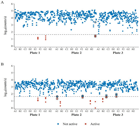 Active hits, for further workup from duplicate plates, were defined as positive hit bacteria resulting in a reporter bacterium luminescence below the antibacterial threshold (AbT) defined in Equation (1).
