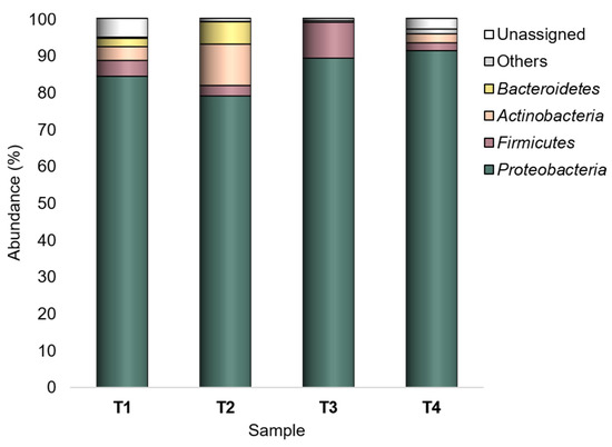 The clustering analysis (Figure 8) confirmed that the bacterial communities found in T1 and T3 did not show significant differences (p < 0.05, SIMPROF test). In addition, the hierarchical clustering dendrogram showed that T4 communities were the most dissimilar.