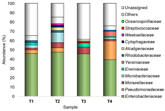 However, Enterobacteriaceae, Pseudomonadaceae, Moraxellaceae, Microbacteriaceae, Erwiniaceae, Yersiniaceae, Rhodobacteraceae, Alcaligenaceae, Cytophagaceae, Weeksellaceae, Streptococcaceae, and Oceanospirillaceae were recognized as major (Ra ≥ 1% in at least one sample) families (Figure 2).
