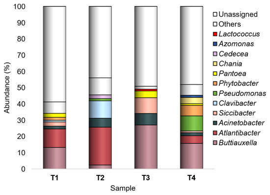 Chania, Cedecea, Azomonas, and Lactococcus were recognized as major genera only in one experimental condition: Chania in T4 (3.9%), Cedecea in T2 (2.3%), Azomonas in T4 (1.3%), and Lactococcus in T3 (1.1%).