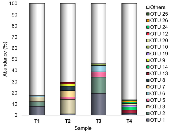The four experimental conditions shared 59 out of 10,287 OTUs, representing the core microbiota (Figure 5). Except for OTU 7, which was shared only by three experimental conditions (T1, T2, and T3), the core microbiota included all the other most abundant OTUs.