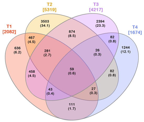 The shared OTUs among the experimental conditions were visualized by a 4-way Venn diagram, generated using the InteractiVenn tool (http://www.interactivenn.net/index2.html, accessed on 1 October 2022) [43].