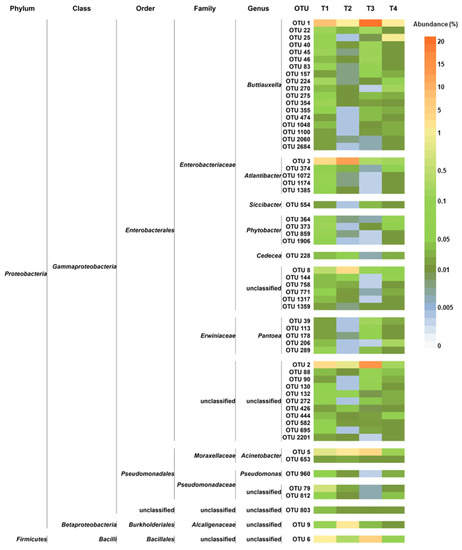 In T4, 74% of the recovered OTUs were exclusive. These OTUs (with Ras in-between 0.03–1.66%; among them, only three OTUs had Ra ≥ 1%) accounted for 71.6% of the peel epiphytic bacteria of SB tomatoes grown under CF. At the phylum level, these OTUs were ascribed to Proteobacteria, Actinobacteria, Firmicutes, Bacteroidetes, Cyanobacteria, Tenericutes, and Verrucomicrobia (Table S4). In addition, the OTUs classified at the genus level were ascribed to 63 genera; Pseudomonas, Buttiauxella, Phytobacter, Chania, and Atlantibacter (80, 71, 65, 55, and 51 OTUs, respectively) were the most abundant (Table S4).