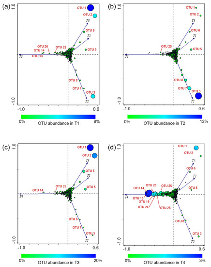 As an overview, it is possible to observe a cloud of OTUs at the axis intersection, indicating a cluster of OTUs showing no notable differences (in distribution and abundance) among the various experimental conditions. By contrast, some OTUs, well separated from the cluster, appear to be much more oriented toward a certain condition. In particular, OTU 1, OTU 2, OTU 5, and OTU 6 were close to T1 and T3 (Figure 7a,c). As reported above, OTU 1, OTU 2, and OTU 6 showed different abundances according to the farming condition, having higher abundances in both tomato genotypes grown under OF; OTU 5 was detected with the highest abundance in T3. OTU 3, OTU 7, and OTU 8 were closer to T2, showing their highest abundances in WT tomatoes grown under CF (Figure 7b). OTU 13, OTU 14, OTU 19, OTU 20, OTU 24, OTU 25, and OTU 26 were ordered along the T4 vector (Figure 7d); these OTUs were detected with Ras in-between 1–3% only in SB grown under CF, whereas they were rare OTUs in all other conditions.