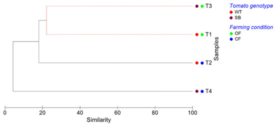 Alpha diversity analysis was assessed by the Shannon diversity and Pielou evenness indices. The Shannon index was 6.734, 6.821, 5.515, and 6.673 for T1, T2, T3, and T4, respectively. It significantly differed between SB tomatoes grown under OF and CF, whereas no differences were observed between WT tomatoes in relation to the farming condition (based on Solow test). Considering the farming conditions, Shannon index values significantly differed between WT and SB grown under OF, but not between WT and SB grown under CF (Solow test). The Pielou index was 0.881, 0.795, 0.661, and 0.899 for T1, T2, T3, and T4, respectively. According to the Solow test, significant differences in community evenness were revealed among all experimental conditions except for T1 (WT/OF) and T4 (SB/CF). Overall, alpha diversity indicated that the T3 (SB/OF) peel-associated bacterial communities showed the lowest diversity and evenness (lowest Shannon and Pielou index values), and therefore they were characterized by the presence of some dominant OTUs.