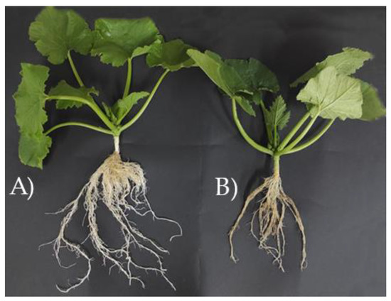 Figure 1. Zucchini plants 24 days after the inoculation. (A) Trichoderma harzianum T22 inoculated plant; (B) not inoculated control plant.