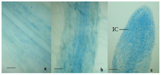 Figure 2. Light micrographs of zucchini roots stained with Tryptan blue and Pelikan blue dyes. (a,b): roots sections of control (not inoculated); (c): apex of primary root inoculated with T. harzianum T22, IC: intracellular structures; Bars = 100 μm.