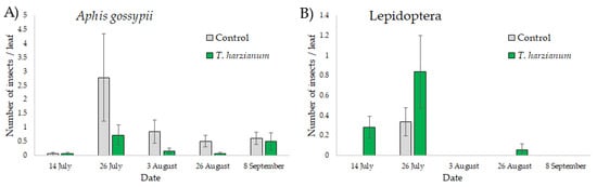Leaf samples were collected for observation of the arthropods in the laboratory. During this sampling period, 256 arthropod specimens were collected on zucchini leaves, of which 107 and 149 were obtained from plants with T. harzianum T22 and control, respectively. The arthropods on zucchini leaves belonged to the families Aphididae (one species identified: apterous morph of Aphis gossypii), Cicadellidae, Thripidae, Chrysomelidae, Gryllidae, Coccinellidae (adults), Syrphidae (identified as eggs or adults), Braconidae (adults), and Miridae. We also collected eggs of Lepidoptera, 9 individuals belonging to the order of Araneae, 5 individuals of Tetranychus urticae, and 5 leaf mines of Liriomyza trifolii Burges (Diptera, Agromyzidae). The abundances of Cicadellidae, Thripidae, Gryllidae, Chrysomelidae, Coccinellidae, Miridae, Syrphidae, Braconidae, Araneae, T. urticae, and leaf miners were very low during the whole sampling period (Figure S2) and consequently were excluded from the analysis.