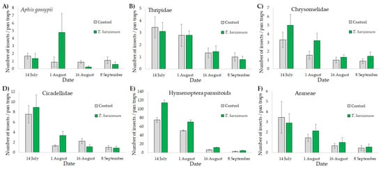 Figure 4. Mean values (± standard errors) of the number of winged Aphis gossypii (A), Thripidae (B), Chrysomelidae (C), Cicadellidae (D), Hymenoptera parasitoids (E), and Araneae (F) collected with pan trap sets placed near plants inoculated with T. harzianum T22 and control at the four sampling dates.