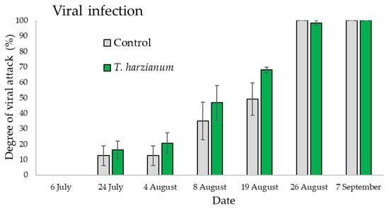 The ANOVA performed on the data relating the viral infection gave significant differences among sampling dates (F6,28 = 127.6, p < 0.001) but not between treatment (F1,28 = 2.4, p = 0.13) or for the “treatment X date” interaction (F6,28 = 0.76, p = 0.61) as shown in Figure 5. The viral infections, in all plots, started on 24 July on both treated and untreated plants and continuously increased over time until the end of the cultivation period, reaching the 100% of infection at the beginning of September. On 7 September there was no difference in the viral symptoms observed in the field between the untreated (control) and treated (T. harzianum T22) plants per plot (Figure 5).