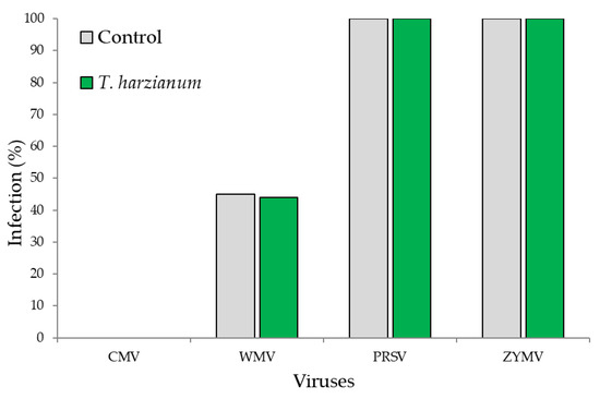 The results of the ELISA serological assay demonstrated that of the four most common zucchini viruses (CMV, ZYMV, PRSNV, and WMV), only one virus (CMV) was not present in the experimental field, while all others were detected. In particular, ZYMV and PRSNV were detected at 100%, WMV had a 45% of incidence in control plants and a 44% incidence in the T. harzianum T22-treated ones (Figure 7). In summary, our results showed that zucchini plants were infected by the three of four most common viruses and the viral incidence was not much different between the control and T. harzianum T22-inoculated plants.