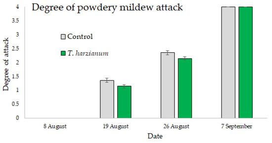 Regarding the influence of the virosis on powdery mildew symptoms of the zucchini plants, it was observed that in plants with the same symptoms of virosis, the powdery mildew infection was more evident for the control plants compared with the T. harzianum T22 inoculated ones (Figure 6). Furthermore, the ANOVA performed on these data gave significant differences related to the virosis classes (F4,514 = 398.7, p < 0.001) and between treatments (F1,514 = 21.9, p < 0.001) but not for the “virosis classes X treatment” interaction (F4,514 = 0.6, p = 0.66), as shown in Figure 6.