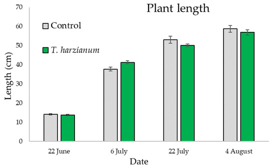 The experiment was carried out on a strip of soil of about 40 m long and 14 m wide, divided into 6 plots of 22.5 m2 (9 m × 2.5 m) separated from each other by a strip 3 m wide left without plants. Thus, 3 plots treated with T. harzianum T22 and 3 control plots were obtained, alternating along the length of the field. The plants in each plot were manually transplanted on 6 June 2022 in 2 rows 1.8 m apart from each other. Each row was 8 m long with a plant spacing of 66 cm, with a total of 12 plants/row (24 plants/plot).