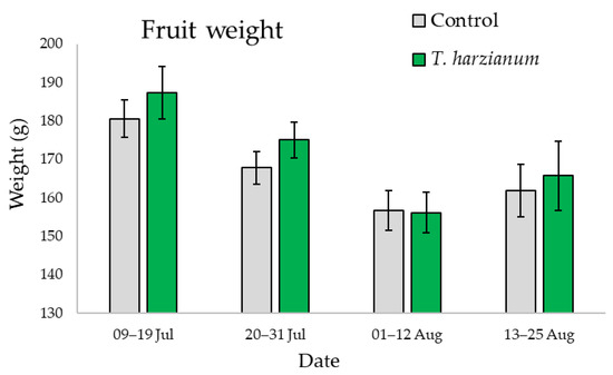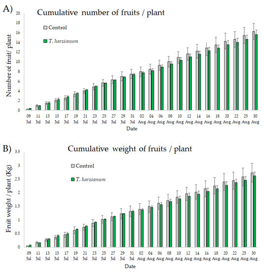 The zucchini fruits were first harvested on 9 July (33 days from transplanting) and were successively collected every two days until 22 August. From 22 August to 30 August, zucchini fruits were collected every four days. For each harvest, marketable fruits were counted and weighed for each experimental plot. The mean values of the weight of the zucchini fruits and the cumulative number and weight of the zucchini fruits per plant harvested from the plots inoculated with T. harzianum T22 and from the controls from 9 July to 30 August were then calculated.