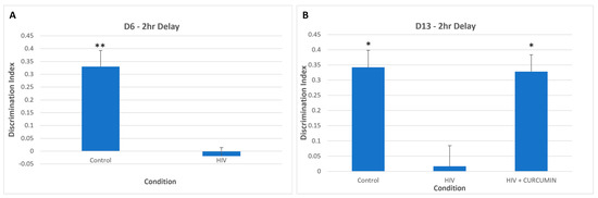 Object recognition testing of Control, HAND (HIV) saline treated, and HAND (HIV) curcumin treated (50 mg/kg) mice. Day 6 with 2 h delay, before introduction of the novel object, in Control and HAND mice (A). Day 13 with 2 h delay in Control, HAND and HAND treated with curcumin (B). * p =0.00015,** p = 0.000003.