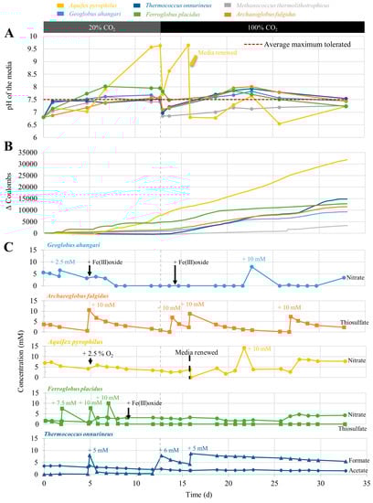 (A) The pH evolution; (B) current consumption between consecutive timepoints calculated by (Ibiotic − Iabiotic) ∗ (tn − tn−1): for graphic depiction, Δ coulombs was subsequently averaged over 30 timepoints to normalize the curve; and (C) consumption of soluble electron acceptors in long-term experiments over time. CO2 was increased from 20% to 100% on day 13. In Aquifex pyrophilus, the media were renewed on day 16 due to high pH. Fe(III) reduction could not be quantified in this experiment due to partial sedimentation in the H-cell and O2 contamination of the samples.