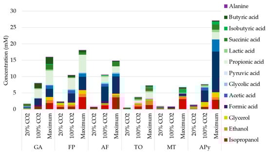 Overall, the total concentration of products was 4 to 10 times higher at the end of the 20 days at 100% CO2 than at the end of 13 days at 20% CO2. This difference in production is not related to longer cultivation period, as higher production per day was observed at 100% CO2 (Supplementary Figure S3). APy showed the maximum organic production, reaching up to 12.4 mM of formic acid, 3.6 mM of acetate, 1.5 mM of glycerol, 1.6 mM of succinic acid, and 0.8 mM of lactic acid on day 16. A maximum of 3.7 mM of isopropanol and 5.4 mM of propionic acid were obtained by FP, 1.2 mM of isobutyric acid by MT, 0.35 mM of Glycolic acid by AF, 0.85 mM of ethanol by TO, and 2.2 mM of butyric acid by GA.
