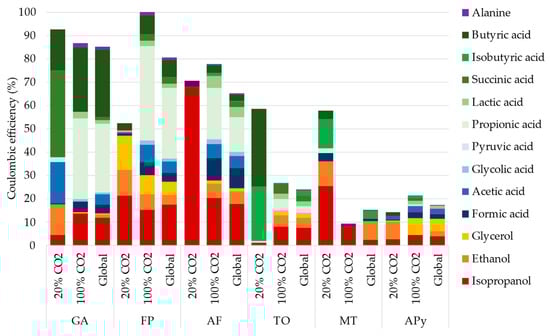 The coulombic efficiency (CE, Figure 4) for each condition and at the end of the experiment allows to clearly see the difference in metabolism affected by the CO2 supply concentration. As main changes, GA converts most of the electron received from the electrode (86% in total) into ethanol, acetate, succinate, and butyrate at 20% CO2, and switches to isopropanol, propionate, and butyrate at 100% CO2. FP, with a total CE of 80%, starts diverting electrons into propionate only at 100% CO2. AF, with a total CE of 65%, produces mainly isopropanol at 20% CO2, but switches to more diverse production at 100% CO2. The Thermococcales (TO) produce mainly butyric and isobutyric acid at low CO2 and more diverse production at high CO2 percentage, with a lower total CE of 24% at the end. As no acetate consumption could be observed on TO, formate was added at day 5, 13, and 16 to act as an alternative carbon source to observe its effect on organic production and current consumption. Formate was consumed rapidly at the first addition, and the consumption slowed after increase at 100% CO2. MT, with a more diverse production at 20% CO2, produces mainly isopropanol at 100% CO2 to a total CE of 14%. Methane production would be expected by this methanogen but has not been quantified during the experiment. Moreover, the focus of this study is to find alternative electrosynthesis production, as methane electrosynthesis was already reported by other methanogens. Finally, APy, which exhibits the highest organic production, only transfers up to 17% of the consumed electron into this organic production and switches between ethanol and glycerol with the percentage of CO2.