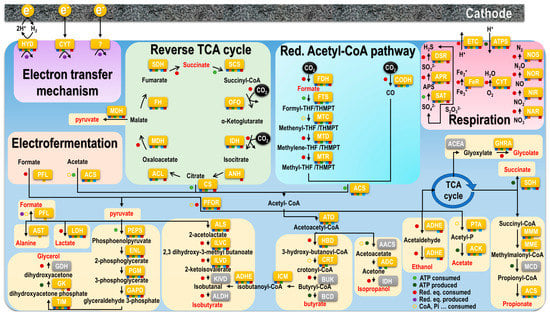The growth of strains we observed on the cathode is complemented by a production of diverse organic acids, including the conventional electrosynthesis products, such as ethanol, isopropanol, formic acid, acetic acid, propionic acid, butyric acid, and isobutyric acid [2]. However, our (hyper)thermophilic strains also exhibited the production of unconventional products for electrosynthesis, such as glycerol, succinic acid, glycolic acid, lactic acid, and alanine, that have never been reported before from only CO2 as the carbon source, but some such as glycerol, succinate, or lactate could be produced from intermediates such as carbohydrates or other organic acids [15,16]. While some products are common to all strains, differences in production ratio can be observed depending on the CO2 fixation pathway or phylogenetic group. Understanding their metabolic pathway is then of interest. It has been suggested that electron overfeeding from a polarized cathode and excess of CO2 promote a release of intermediates from carbon metabolism due to an “overload” of respective pathways [6,17]. While the taxonomic groups we tested cover a wide spectrum of metabolic type and carbon fixation pathways, they employ similar catabolic and anabolic mechanisms [18].