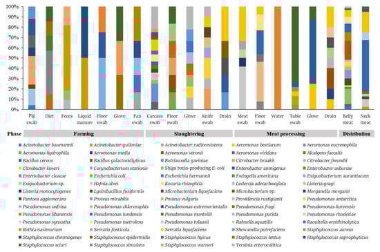 The following supporting information can be downloaded at: https://www.mdpi.com/article/10.3390/microorganisms10112252/s1, Table S1: Pathogenic or spoilage bacteria isolated from the pig farms, slaughterhouse, meat processing plant, and retail stores.