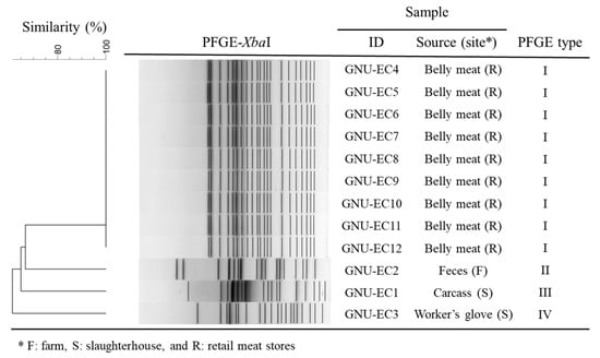 Genomic DNA of 12 STEC isolate strains were digested with XbaI to determine genetic relatedness of the isolates for tracking the pathogens from farm to distribution. The isolates were classified into four pulsotypes based on PFGE banding patterns with more than 99% similarity (Figure 2). The dendrogram of PFGE profiles by XbaI-digestion shows that all STEC isolates grouped in pulsotype I were isolated from belly meats at the retail stores. On the other hand, the other isolates (GNU-EC1, GNU-EC2, and GNU-EC3) showed exceedingly different PFGE band patterns by sample source or site.