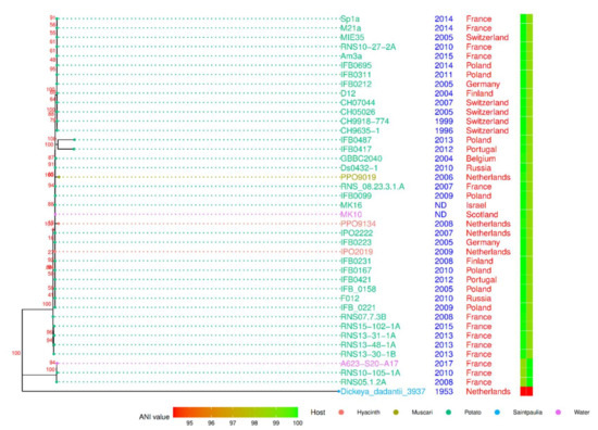 - Pedron, J.; Gijsegem, F.V. Diversity in the Bacterial Genus Dickeya Grouping Plant Pathogens and Waterways Isolates. 2019. Available online: https://www.lidsen.com/journals/genetics/genetics-03-04-098 (accessed on 13 January 2022).