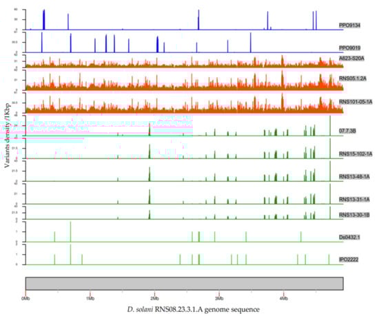 2.5. Phylogenetic Analysis and Annotation of Variants’ Hotspot Regions within D. solani Strains