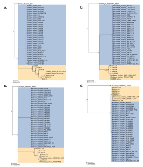 - Golanowska, M.; Potrykus, M.; Motyka-Pomagruk, A.; Kabza, M.; Bacci, G.; Galardini, M.; Bazzicalupo, M.; Makalowska, I.; Smalla, K.; Mengoni, A.; et al. Comparison of Highly and Weakly Virulent Dickeya Solani Strains, with a View on the Pangenome and Panregulon of This Species. Front. Microbiol. 2018, 9, 1940. [Google Scholar] [CrossRef] [PubMed]