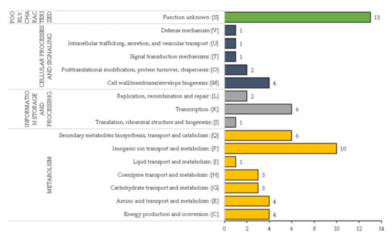 - Huerta-Cepas, J.; Szklarczyk, D.; Heller, D.; Hernández-Plaza, A.; Forslund, S.K.; Cook, H.; Mende, D.R.; Letunic, I.; Rattei, T.; Jensen, L.J.; et al. EggNOG 5.0: A Hierarchical, Functionally and Phylogenetically Annotated Orthology Resource Based on 5090 Organisms and 2502 Viruses. Nucleic Acids Res. 2019, 47, D309–D314. [Google Scholar] [CrossRef] [PubMed]
