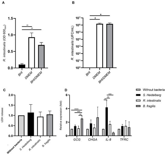 Impact of beneficial bacteria (Roseburia intestinalis and Bacteroides fragilis) and pathogenic bacteria (S. Heidelberg) on quadricellular model. (A,B) R. intestinalis and B. fragilis growth characterization, (A) overnight culture in BHI, or in DMEM media and in a medium containing a mixture of BHI and DMEM (1:1, v/v): (B) Enumeration of overnight culture in the same media. (C) LDH release after 3 h of incubation of bacteria with the quadricellular model. The results were normalized to cells without bacteria. (D) Analyze of genes expression implicated in endocrine (GCG and CHGA), in immune (IL-8) functions and transferrin receptor (TFRC) after 3 h of incubation. Normality of each condition was checked by Shapiro test and one-way ANOVA was used. * p < 0.05; ** p < 0.01; *** p < 0.001; and **** p < 0.0001.