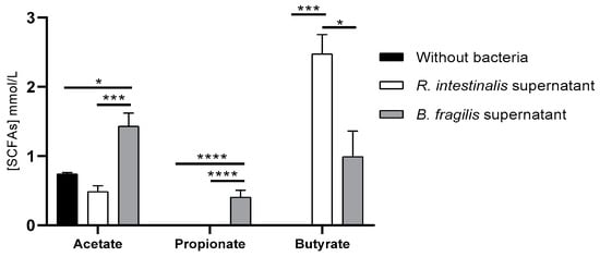 To determine if R. intestinalis and B. fragilis growing in complete DMEM produced SCFAs, a GC/MS analysis was conducted to examine the presence of the SCFAs in their supernatant. For R. intestinalis supernatant, butyrate (average 2.47 mmol/L) and acetate (average 0.40 mmol/L) were detected after 24 h of culture with a significant difference for butyrate only compared to complete DMEM without bacteria (Figure 4). For B. fragilis supernatant, a significant increase can be observed in the concentrations of acetate (1.43 mmol/L) and propionate (0.40 mmol/L) compared to complete DMEM and B. fragilis supernatant, whereas butyrate (0.99 mmol/L) was significantly increased compared to complete DMEM but significantly less than in R. intestinalis supernatant.