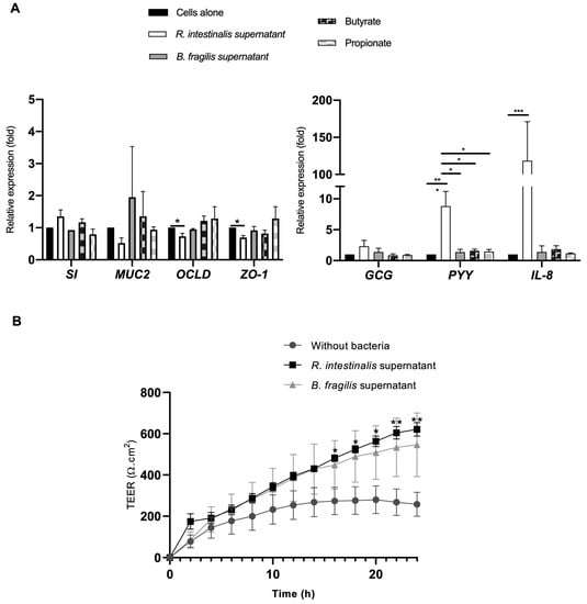 Stimulation of the quadricellular model with R. intestinalis or B. fragilis supernatants; with butyrate sodium (1.26 mmol/L) or propionate sodium (0.20 mmol/L): (A) Relative expression of specific genes implicated in barrier function (SI, MUC2, OCLD, and ZO-1), in endocrine function (GCG and PYY) and in immune response (IL-8) after 24 h of incubation; (B) impact on the TEER during 24 h for R. intestinalis and B. fragilis cell-free supernatant. Normality of each condition was checked by Shapiro test and Kruskal–Wallis test was used * p < 0.05; ** p < 0.01 and *** p < 0.001.