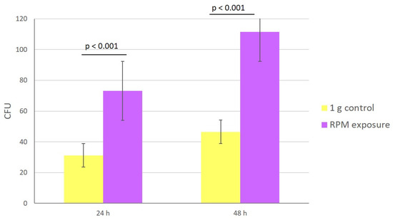 Under simulated microgravity, spore production was twice as high as in the 1 g control condition (Figure 2). Indeed, after inoculation with the same quantity of cells, at 24 h of incubation, 73 and 31 CFU were observed under simulated microgravity and 1 g control conditions, respectively (p < 0.001). At 48 h of incubation, the number of colonies was 111 and 46, respectively, under the conditions described above (p < 0.001).