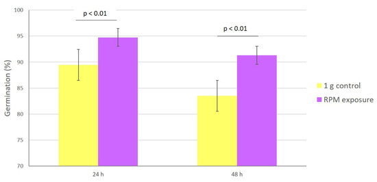 The germination ratio was higher under simulated microgravity than under 1 g control conditions (Figure 3). At 24 h of incubation, the percentage of germinated spores was 89% in 1 g control samples and 95% in RPM-exposed samples (p < 0.01); at 48 h, the values were 84 and 91%, respectively (p < 0.01). Under RPM exposure, multiple germination tubes on several areas of the spore were observed, while they were absent in the control condition (Figure 4).