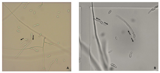 Multiple germination tubes on spores in microgravity. Multiple germination tubes observed using optic microscopy on spores of the CBS 124889 strain obtained 1 g control (A) or under simulated microgravity (B) at 48 h (arrow to visualize the direction of germination) (×200).