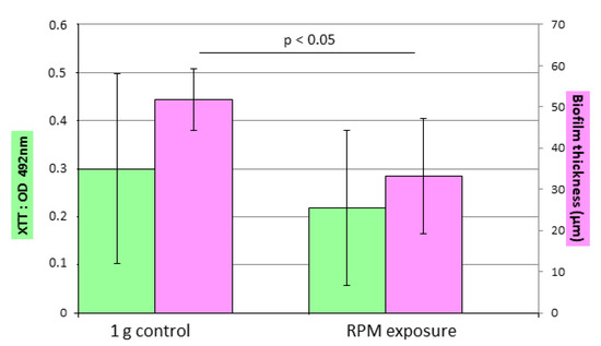 By two complementary approaches, we demonstrated a decrease in Fusarium biofilm formation under RPM exposure while Candida albicans grown under simulated microgravity presented a more complex biofilm [19]. However, it was recently shown that this microorganism forms a biofilm with fewer retained cells in the biofilm when cultivated on the ISS [18].