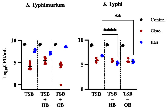 Persister cells recovered in S. Typhimurium 14028 and S. Typhi Ty2 laboratory strains after treatment with ciprofloxacin (red circles) or kanamycin (blue circles) in planktonic cells growing in ox bile (OB) or human bile (HB) versus total cells (strains not treated with antibiotics are represented by black circles). Representative charts are shown from one experiment performed with four or more biological replicates and repeated at least three times with similar results. A one-way ANOVA followed by Tukey’s multiple-comparison test were used to compare the different conditions (**, p ≤ 0.01; ****, p ≤ 0.0001).