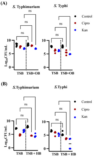 Persister cells recovered in S. Typhimurium 14028 and S. Typhi Ty2 laboratory strains after treatment with ciprofloxacin (red circles) or kanamycin (blue circles) in biofilms growing in ox bile (A) or human bile (B) versus total cells (strains not treated with antibiotics are represented by black circles). Representative charts are shown from one experiment performed with four or more biological replicates and repeated at least three times with similar results. A one-way ANOVA followed by Tukey’s multiple-comparison test were used to compare the different conditions (ns, not significant).