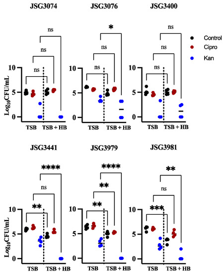 Persister cells recovered in S. Typhi clinical strains after treatment with ciprofloxacin (red circles) or kanamycin (blue circles) in biofilms on human bile versus total cells (strains not treated with antibiotics are represented by black circles). Representative charts are shown from one experiment performed with four or more biological replicates and repeated at least three times with similar results. A one-way ANOVA followed by Tukey’s multiple-comparison test were used to compare the different conditions (ns, not significant; *, p ≤ 0.05; **, p ≤ 0.01; ***, p ≤ 0.001; ****, p ≤ 0.0001).