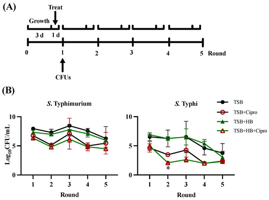 It has been reported that periodic and repetitive treatment of patients with antimicrobials commonly leads to hyperpersistance, where mutations that favor persistence are accumulated [40,41,42,43]. Furthermore, bacterial persistence has been shown to adjust rapidly to antimicrobial treatment frequencies, driving swift evolutionary adaptation [44]. In order to simulate a hypothetical condition where a chronic typhoid patient would receive several rounds of ciprofloxacin treatment, we set up an in vitro experiment where Salmonella biofilms were grown in conditions where bile was replenished, as it is in the GB [45], and then allowed to grow for a period of time before treatment with ciprofloxacin, with this cycle repeating five times. The results, summarized in Figure 5, indicate that there is a steady decline in total cell numbers after the continued rounds of antibiotic treatment in GB conditions. This was not expected but perhaps not surprising, as the continued onslaught of fresh bile plus antibiotic is a very challenging treatment. As the literature reports [40,41,42,43], the percentage of persisters in rich media (control) increased dramatically for S. Typhimurium, from 6.47 to 57.74%. Unexpectedly, bile had the opposite effect, reducing the percentage of persisters from 8.61 to 3.82%. S. Typhi displayed a more modest but opposite response; in the control conditions, persisters decreased from 1.36 to 0.1% but presented a modest increase from 2.34 to 3.13% in GS conditions. This could possibly reflect the evolutionary process that S. Typhi has undergone as a human pathogen, using the GB and GS as a niche for persistence.