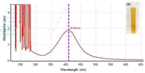 UV-Vis spectra of silver nanoparticles at 410 nm; inset (a): TA-AgNPs colloid showed a yellow color.