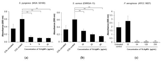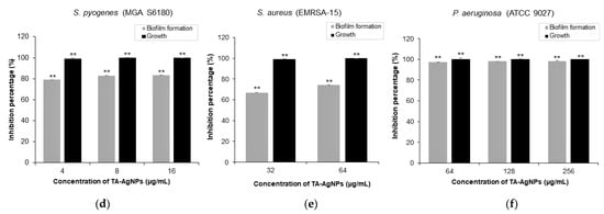 A minimum biofilm eradication concentration (MBEC) is described as the lowest concentration of an antimicrobial agent required to eradicate biofilm []. The microdilution assay was performed to test the biofilm eradication activity of TA-AgNPs. MBEC was defined as the lowest concentration of antimicrobial agents that led to a final OD similar to the negative control (broth only) []. To promote the biofilm formation of Gram-positive bacteria, the microtiter plates were coated with collagen solution. The results showed that the biofilm formation of S. pyogenes and S. aureus were increased when they were cultured in collagen-coated plates (Figure 2a,b). In terms of biofilm eradication, the results exhibited that TA-AgNPs significantly (p < 0.01) inhibited the growth of planktonic bacteria and eradicated the established biofilm of P. aeruginosa with the MBEC value of 128 µg/mL (Table 3, Figure 2c,f), while the MBEC of TA-AgNPs against S. pyogenes and S. aureus were higher than 16 and 64 µg/mL, respectively (Table 3). As shown in Figure 2a,b, when treated with TA-AgNPs ranging from 4 to 16 µg/mL and 32 to 64 µg/mL, the biofilm biomass of S. pyogenes and S. aureus were significantly reduced, respectively (p < 0.01). In Figure 2d, the biofilm formation of S. pyogenes was significantly inhibited in a range from 78.97% to 83.45% when TA-AgNPs increased from 4 to 16 µg/mL (p < 0.01). For S. aureus, as shown in Figure 2e, the biofilm formation was significantly inhibited to 66.84% and 74.51% when treated with TA-AgNPs at the concentration of 32 and 64 µg/mL, respectively (p < 0.01). To determine the effect of TA-AgNPs on growth inhibition, all tested concentrations of TA-AgNPs (as shown in Figure 2d–f) could significantly inhibit the growth of all three planktonic bacteria in the range of 98.93% to 100% (p < 0.01). These results demonstrated that TA-AgNPs could reduce the biofilm biomass and affect the bacterial growth.