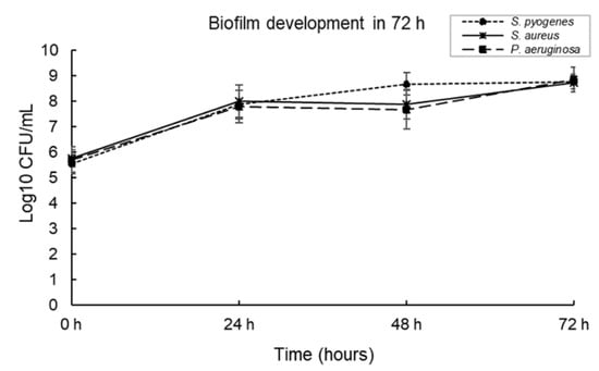 Three-species biofilms were cultured in the DBD model at 33 °C for 72 h and enumerated at 24-h intervals. S. pyogenes, S. aureus and P. aeruginosa were used as representative wound pathogens. As shown in Figure 5, a three-species biofilm could grow in this model in a steady state. All three bacteria were detectable at the 24 h, 48 h and 72 h time points.