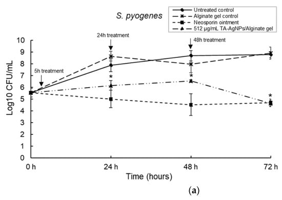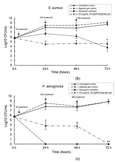 The first dose of antibacterial alginate hydrogel was applied at 5 h; this time point was taken to be the pre-Gram negative shift and allowed for the establishment of the biofilm []. The untreated biofilm was used as a control to compare any growth changes. Three-species biofilms comprised of S. pyogenes, S. aureus and P. aeruginosa and were cultured in the DBD model for 5 h, 24 h and 48 h prior to treatment with three separate doses of TA-AgNPs/Alginate hydrogel. Antibiotic ointment (Neosporin®) was used as a positive control and the alginate hydrogel without TA-AgNPs was used as a negative control. To count the recovery cells, TVC was performed at 24, 48 and 72 h. The application of TA-AgNPs/Alginate hydrogel against S. pyogenes at 5 h and 24 h resulted in significantly (p < 0.05) reduced bacterial numbers. At 48 h, the results showed a 3-log reduction in bacterial numbers compared to the untreated control (p < 0.05) (Figure 6a). For S. aureus, as shown in Figure 6b, the number of bacteria were significantly (p < 0.05) reduced to a 3-log reduction when TA-AgNPs/Alginate hydrogels were applied for three separate doses at 5 h, 24 h and 48 h. Interestingly, among the three-species biofilm, P. aeruginosa was no longer detectable after being treated with three doses of TA-AgNPs/Alginate hydrogel and no bacteria recovered in number over 72 h (p < 0.01) (Figure 6c). Additionally, no Gram-negative shift was observed when treated with multiple doses of TA-AgNPs/Alginate hydrogel.