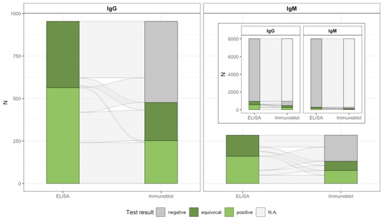 Alluvial diagram from two-tier sample testing for IgG and IgM antibodies against B. burgdorferi s.l.; IgG = Immunoglobulin G; IgM = Immunoglobulin M. We used ELISA as the screening test and a line immunoblot as the confirmatory test. ELISA-negative samples did not undergo confirmatory testing by protocol; therefore, subsequent immunoblot testing is not applicable (N.A.).
