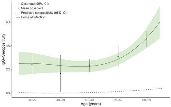 Among the three models for the FOI estimation, Grenfell and Anderson’s model with polynomial functions performed best in terms of the AIC value compared to Muench’s and Griffith’s model (Table S1). In our estimation, the FOI represents the annual average change in the population’s seropositivity proportion and, therefore, a mix of seroconversion and seroreversion. Muench’s constant model estimated the FOI at 0.000637 for all ages (Table S3). Griffiths’ FOI model estimated 0.000634 for individuals aged 20–24 years and 0.000664 for the highest age group, 65–69 years. Grenfell and Anderson’s model estimated varying FOIs over ages, with 0.0000656 for the participants aged 20–24, then negative estimates for the subjects aged 25–39 years, then 0.0000375 for the 40–44 year-olds, increasing to 0.00317 in the participants aged 65–69 years. The predicted seropositivity from Grenfell and Anderson’s model lies close to the observed mean values across 10-year age groups (Figure 2), except for the age group 30–39, where seropositivity prediction lies comparably far from the observed mean probably due to data dispersion within the data of this age group. Overall, predicted seropositivity lies within the 95% confidence interval (CI) of the observed values, and both the observed and predicted seropositivity show a positive trend with advancing age, with a slight decline in the age group 30–39, when considering the mean observed values; however, 95% confidence intervals (CI) overlap.