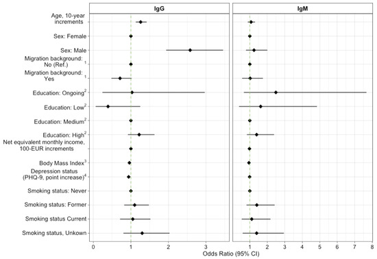 We constructed two binary logistic regression models to obtain the odds ratios (OR) for IgG (model 1) and IgM (model 2) seropositivity for B. burgdorferi s.l. as a function of age, sex, migration background, education, net equivalent monthly income, body mass index (BMI), a depression score and smoking status. For the migration background, we used a set of indicators that considered the participant’s residence post-birth, spoken native language, and the subjects’ parents’ country of birth, as suggested by Schenk [44]. Furthermore, we defined the self-reported education levels as low, intermediate, and high, corresponding to the International Standard Classification of Education level (ISCED97) [45]. We used the International Obesity Task Force classification for BMI [46] and assessed the self-reported depression severity in line with the 9-question Patient Health Questionnaire (PHQ-9) [47]. We included smoking status as a proxy for lifestyle [48].