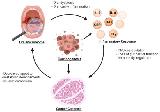 The relationship between the oral microbiome and cancer cachexia is a novel field of research that remains unexplored. However, the gut microbiome in the distal alimentary tract has been implicated in cancer cachexia [5]. Gut barrier dysfunction as well as an imbalance in the gut microbiome has been shown to lead to systemic inflammation, setting the stage for a cachectic response in cancer patients [5]. Jiang et al., specifically examined the role of bacterial translocation in the colon of patients with cancer cachexia. In this study, cachectic patients had a significantly higher prevalence of colonic bacterial translocation when compared to non-cachectic patients. Cachectic patients also exhibited increased concentrations of IL-6, TNF-α, and IFN-γ in their venous blood samples from the middle colic vein. The study concluded that luminal bacterial overgrowth likely occurs secondary to immunosuppression, resulting in increased bacterial translocation. This induces a pro-inflammatory state, raising the metabolic rate and suppressing appetite. This cycle may result in further bacterial translocation which will then lead to a greater cytokine release eventually resulting in a cachectic state, a cycle similar to the one that may potentially be occurring in the oral microbiome [73].