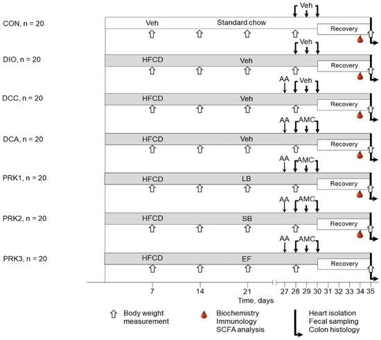The animals were randomized into one of the following seven groups (Figure 1): control (CON, n = 20, each rat received 1 mL of the phosphate buffer); DIO (n = 20, rats with DIO were treated with the phosphate buffer); DCC (n = 20, rats with DIO and CIC were treated with the vehicle); DCA (n = 20, a day after CIC induction, rats with DIO received intragastric administration of amoxicillin (15 mg), metronidazole (15 mg), and clarithromycin (15 mg) mixture suspended in 1 mL of phosphate buffer once per day for three consecutive days); PRK1 (n = 20, rats were treated similarly to DCA group but were additionally daily dosed with a mixture of lyophilized Lactobacillus acidophilus (LA–5) and Bifidobacterium animalis subsp. lactis (BB–12) at a dose of 1.2 × 108 colony-forming unit (CFU)/mL suspended in 1 mL of phosphate buffer for 15 days starting from the day 21); PRK2 (n = 20, rats were treated similarly to DCA group but were additionally daily dosed with 25 mg of Saccharomyces boulardii suspended in 1 mL of phosphate buffer for 15 days starting from the day 21); PRK3 (n = 20, rats were treated similarly to DCA group but were additionally daily dosed with Enterococcus faecium L3 at a dose of 1.2 × 108 CFU/mL suspended in 1 mL of phosphate buffer for 15 days starting from the day 21). After finalization of treatment with antimicrobial agents, the rats were recovered for 5 days before isolation of the heart. All the animals, except those in the CON group, were fed the HFCD throughout the period of recovery. The CON group received a standard diet (0 % sucrose, 12 % fat: Lab Diet, St. Louis, MO, USA) throughout the entire study. The following parameters were monitored: body weight, clinical status, as well as food and water intake at 9:00–10:00 a.m. each day during the 7 days prior to heart harvesting. After the autopsy, the cecum and the retroperitoneal, epididymal, and visceral fat pads were excised and weighed.